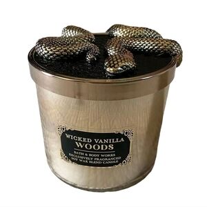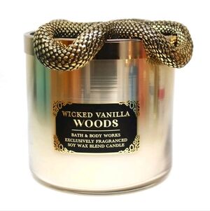 The Bath & Body Works Wicked Vanilla Woods 3-wick candle is a popular Halloween-themed fragrance featuring notes of magical vanilla, glowing amberwood, and enchanted pink pepper. Known for a "spooky" yet sweet, perfume-like scent, it comes in a 14.5 oz soy wax blend, typically featuring a specialized snake-decorated lid. It has a strong, long-lasting throw that burns for approximately 25–45 hours.