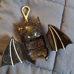 Bath & Body Works Halloween 2023 bat sanitizer holder, black with silver glitter and little rhinestone eyes! Magnetic wing closure and silver clip. Great used condition!