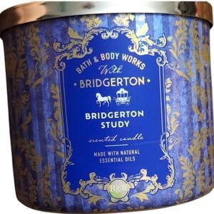 NWT Bath & Body Works x Bridgerton 4-piece set featuring the elegant regency-inspired designs from the limited Netflix collection. Includes the Bridgerton Study 3-wick candle, tea cup Wallflower plug, and two gold Bee PocketBac sanitizer holders. All items are brand new and unused.