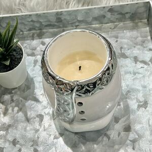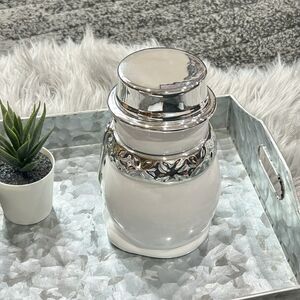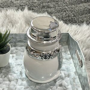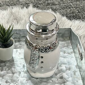 Add a touch of holiday cheer to your home with this Bath & Body Works 2009 limited edition Harry Slatkin snowman candle holder. Crafted from shiny ceramic, this medium-sized candle holder features a traditional design with a snowman shape and a white and silver color scheme. It is perfect for holding your favorite winter scent candle and creating a cozy atmosphere in your kitchen or living room.
