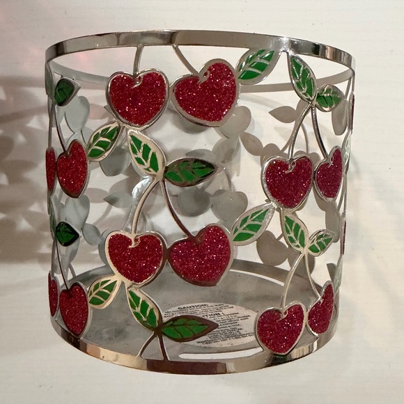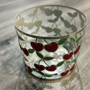 Decorative candle holder featuring red cherries and green leaves. Perfect for adding a touch of charm to any room.