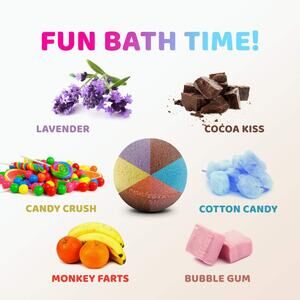 6 DIFFERENT NATURAL BATH BOMBS with different SCENTS: Bubble Gum, Cocoa Kiss, Candy Crush, Cotton Candy, Lavender and favorite kid's - Monkey farts.