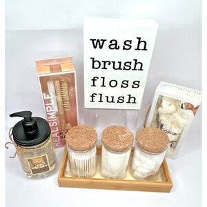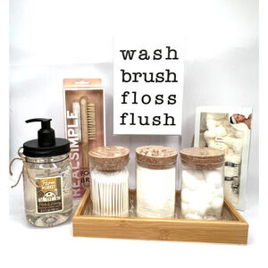 Set includes 1 Meta frame size 7" x 5" x 1 1/2" in white and Clack letters. 1 spa headband in ivory an brown stitching, 1 Real Simple wooden foot brush with pumice stone, 1 Pink Sky 4 piece Beauty & Spa Essentials (set includes 1 bamboo tray 3 glass jars with corks lids that include 20 cotton balls, 40 cotton wipes and 125 cotton swabs). 1 Farm Market Dye Free Milk & Honey Scented Hand soap in 16.5 FL OZ plastic mason jar.