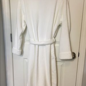 Small white bathrobe, two front pockets, belt and a hook on neckline to hang up. No stains or tears. In great condition.