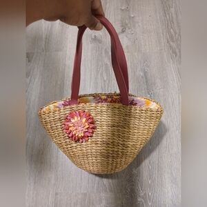 Chic straw tote bag featuring stylish pink handles and a floral accent. Perfect for casual outings and adding a touch of elegance to your look. Has pockets on the inside to store your belongings.