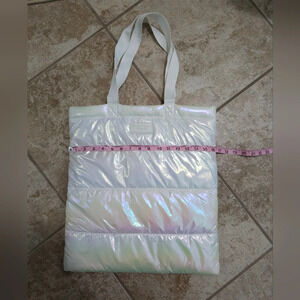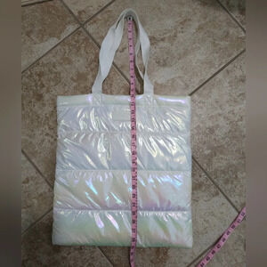 Shiny and glossy Bath and Body Works white iridescent tote bag. Lightweight puffer style with padded body, dual straps, and open interior. Perfect for winter, holiday travel, shopping, or everyday use. Measures approx. 18" tall and 16" wide.