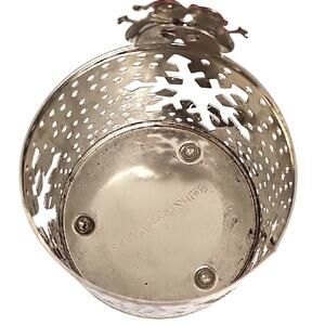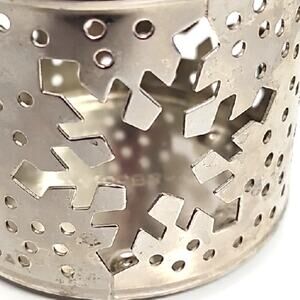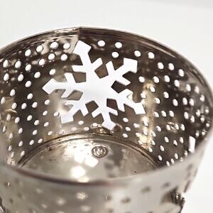 Brighten your home with this charming silver candle holder featuring a delightful snowman design. Perfect for adding a festive touch. From Bath and Bodyworks this holder holds 4 oz. or smaller size candle. It also features snowflake cutouts all around the silver base. Grab it today for yourself or a gift exchange. Great preowned condition with a little sign of candle wax inside.