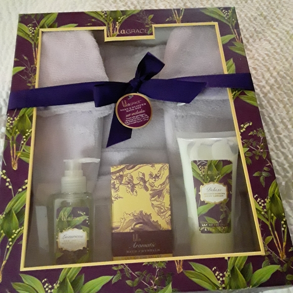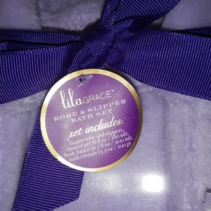 Brand new! Robe,slippers bath salts,shower gel,lilac color ,great fir a delayed xmas gift or a future birthday gift or a a shower gift!