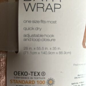 New bath wrap. Peach in color. Size is 28 x 55.5 x35 in. Fits most sizes. Adjustable hook and loop closure. Quick drying.