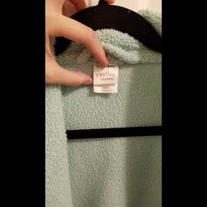 Light Blue bath/pajama robe. Soft and warm without being too thick and suffocating. Has pockets! Outside belt ties around the waist; inside is a second tie closure made of ribbon. *Little black spots are fuzzy pieces. Lint*