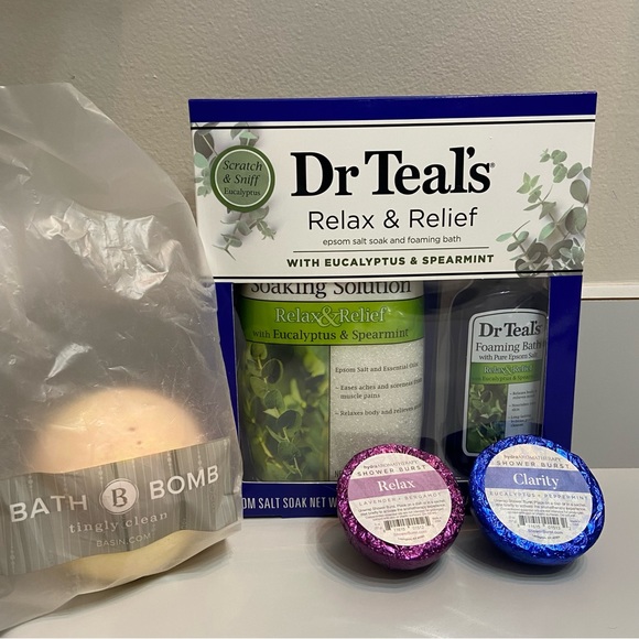 Dr Teal’s Relax & Relief Set includes epsom salt soak and foaming bath with eucalyptus and spearmint.