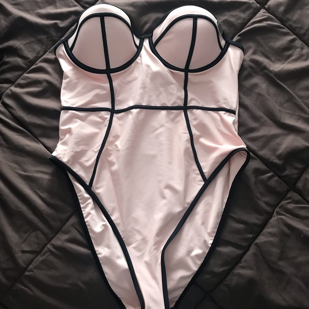 Brand new with tags. Light/pale pink with black outlines. Cups have underwire. Staples
