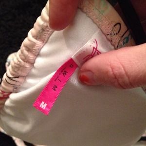 The top is a size medium the bottoms are a large. Pale pink. The ties are black.