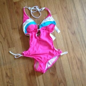 Junior size small one piece with no back NWT pink in color ties at neck,back and hips