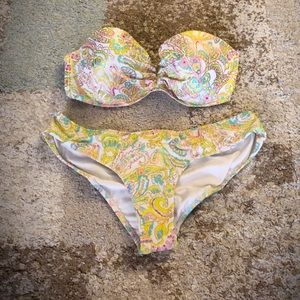 Cute strapless bikini from Victoria’s Secret. The top is the perfect summer color featuring a paisley pattern, a clip back for closure, and the slight push up makes for a perfect swim top! Top size is 36C and the bottoms are a small.