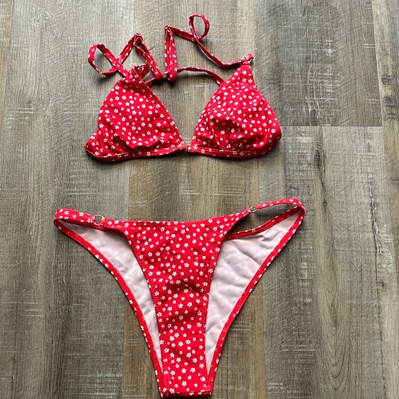 Red bathing suit with cute white flowers on them! Never worn