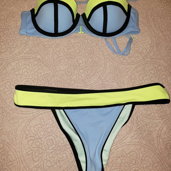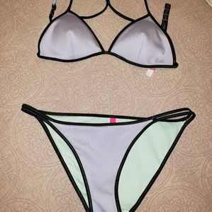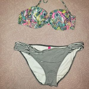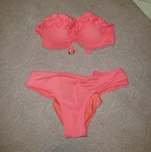 There are five bikini sets and two bikini tops. They are all either NWOT or in great condition (the coral colored bikini has some pilling). The brands are either Victoria's Secret, Target, or Hobie. Looking to sell as a lot but will consider separating. Each bathing suit top is a Medium (or a large that fits like a medium) or 34B, and each bottom is a medium (or a large that fits like a medium).