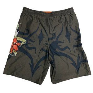 Pull on bathing suit board shorts in trendy cool pattern. Green orange black flower flame. Elastic waist w tie & mesh w Velcro side pocket