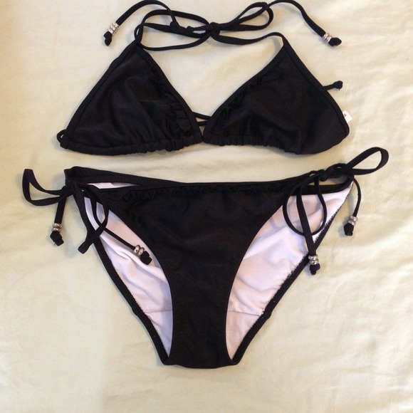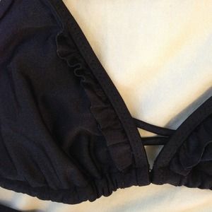 Black bathing suit with ruffles on the top and the bottoms.