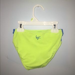 This bikini is adorable! It's a bright neon yellow and blue:) the top has a flowy layer on the front with a design of pineapples. The back is adorable and would be an awesome tan line!!!! The bottoms are neon yellow on the outside with blue sides and blue in the inside. It's a really cute