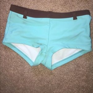 This bathing suit is a teal colored bikini:) the top ties around the neck and the it also has a clip in the back. The bottoms are like shorts but are extremely cute on!
