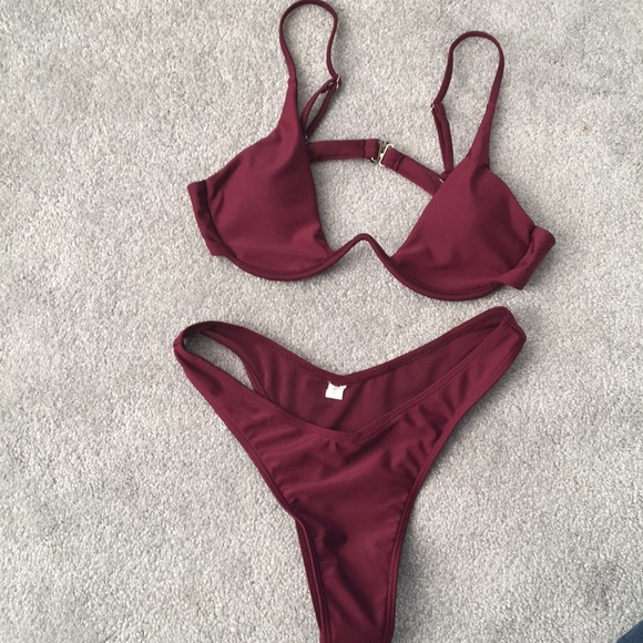 Maroon two piece. Top has adjustable straps and has underwire. The bottoms are high waisted and cheeky. Really cute and sexy on, however top was too big on me. I needed a small. Both are mediums. Brand new, never worn!