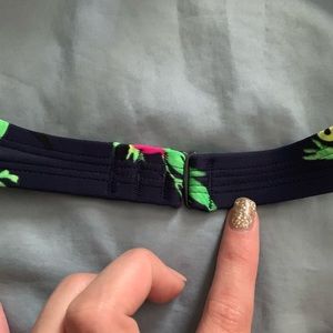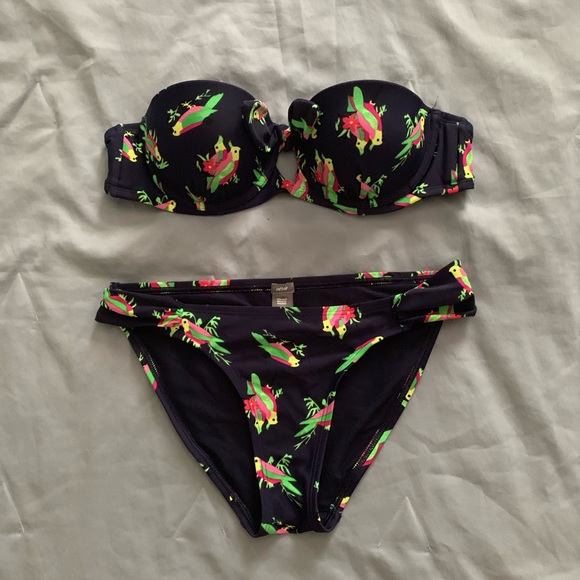 Strapless, push up, bikini top, with underwire and hook closure. Bow and keyhole detail on chest. And classic bikini bottom. Both in tropical print. (Straps are INCLUDED)