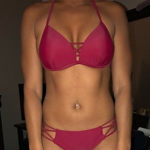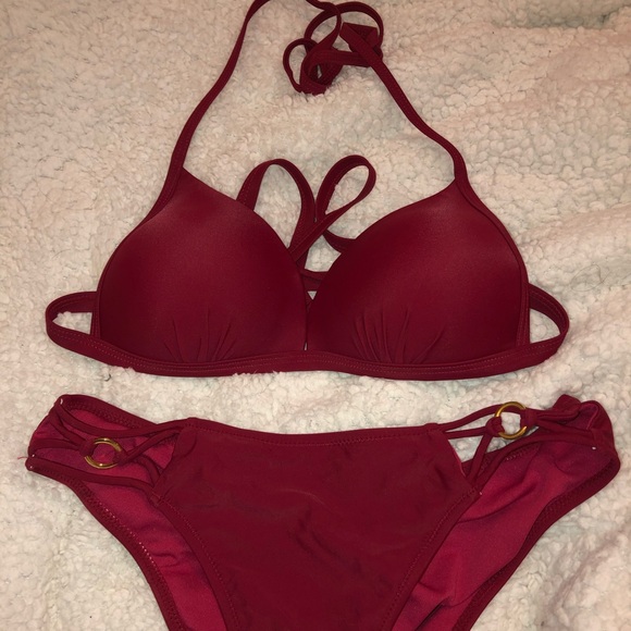 Never worn. Top and bottom are both small. Push up and cute design on bottoms! Burgundy color