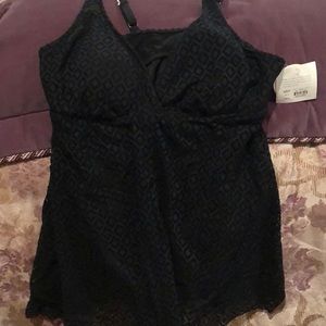 One piece tummy slimmer with adjustable straps. Lace overlay, has discreet control panels to slim your midsection