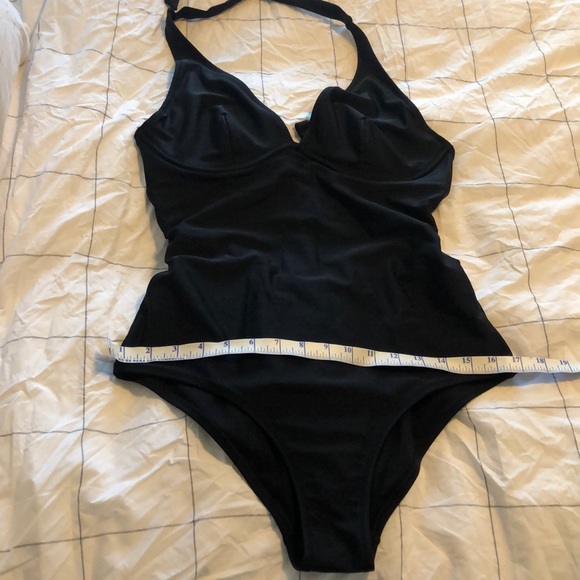 Flattering black one piece bathing suit Halter top with adjustable tie Clasp back Supportive foam cups