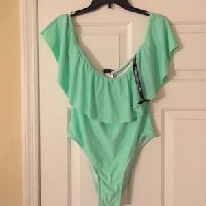 Full piece bathing suit from pretty little thing PYT. Super cute on. New with tags. Pretty mint color. Flattering top. No flaws, smoke free home! Make offer!