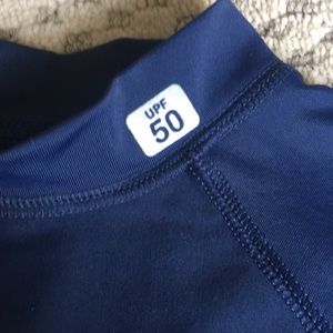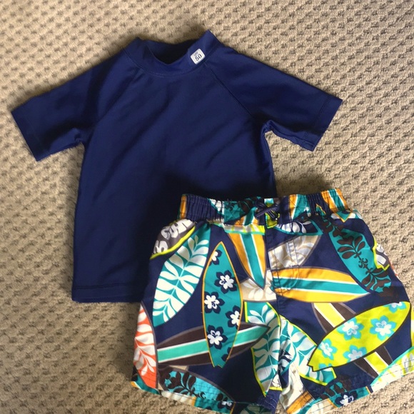 Gently worn boys bathing suit. Top is Circo with a sun protection factor of 50 and the bathing shorts are Carter’s. Both are 18 months