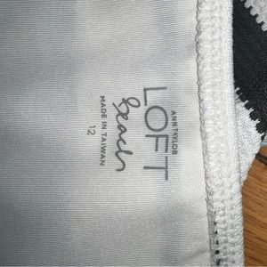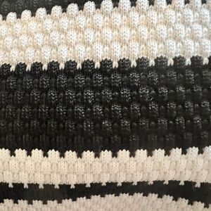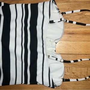 One piece, underwire, stripped black and white textured material with adjustable straps.
