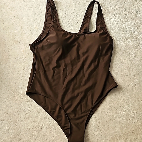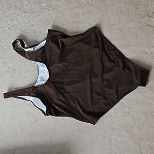women's 1 piece bathing suit. fully lined in the front, has removable bra pads. new, no tags. brown, size XXL, would make it a size 16