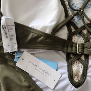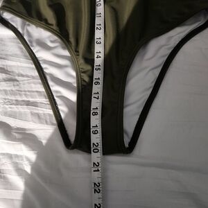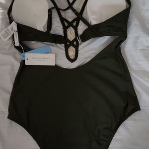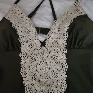 sz. LG. brand cupshe, color medium hunter green, with lace down the front, padded cups,lining,open back. would fit b,c cups. length from under breast 20"