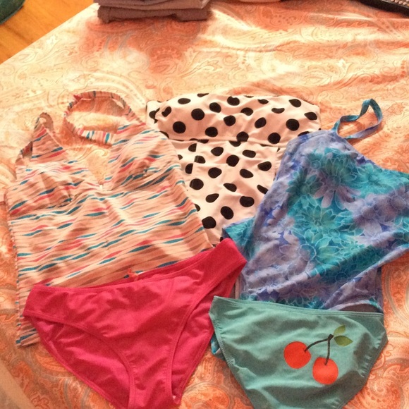 2 bathing suit tops 1 striped M size 1 polka dot M size 2 bathing suit bottoms 1 pink M size 1 cherries girls 9/10 YOUTH and 1 1 piece SIZE 6 they have no brands just brought as various stores
