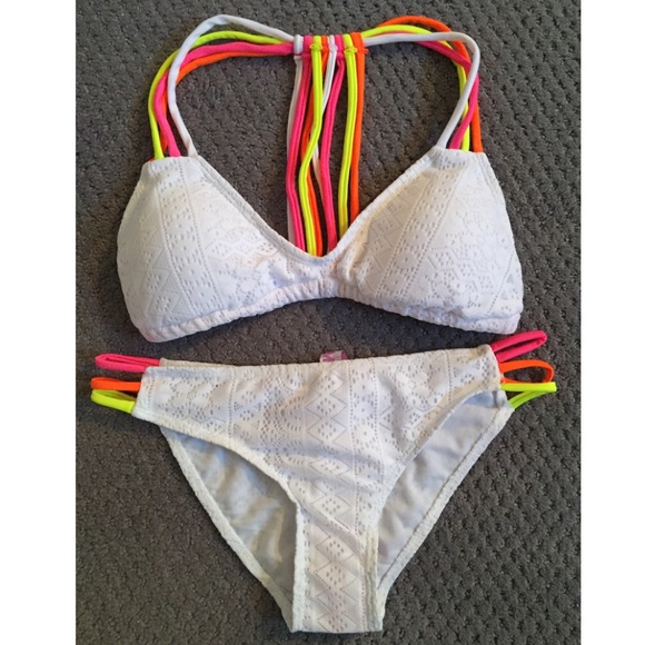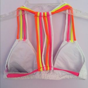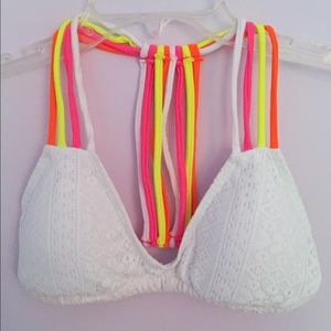 Crochet/lace pattern bathing suit top with racer back multi strap detailing. Removable pads, size small, bottoms for sale as well in different post. Brand new, never worn, tags still attached.