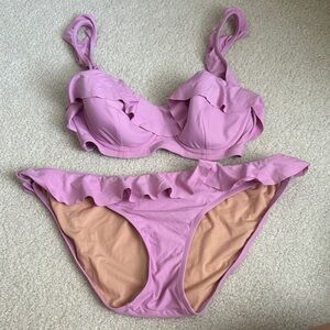 Stylish pink bikini set with ruffled details. Perfect for a beach day.