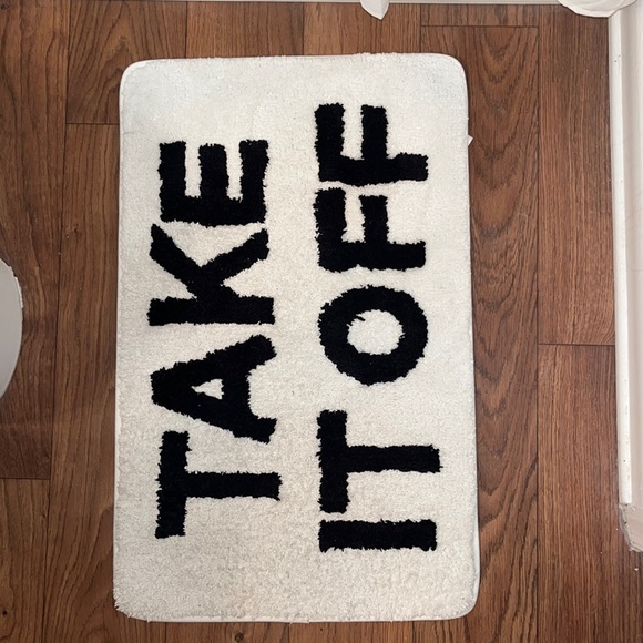 “Take it off bath mat” White fuzzy mat with black lettering