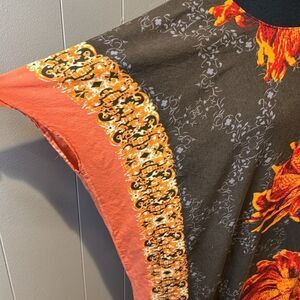 Bati-One Original flowy floral print kaftan. One size. 100% polyester. Side to side at armhole approximately 32 inches. Shoulder to hem approximately 57 inches. Nonsmoking home.