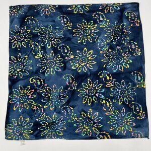 Blue square bandana scarf in a navy blue with batik floral and paisley pattern. 100% Cotton. Made in India.