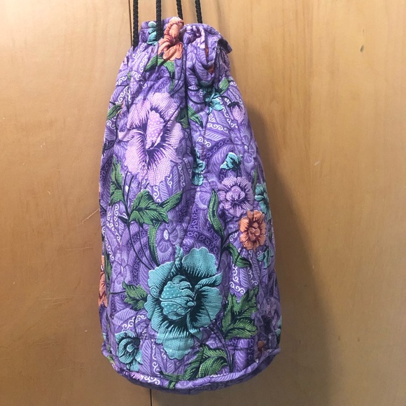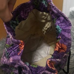 Drawstring bag made of Malaysian Batik textile in floral purple, orange and green. Individualistic, yet functional.