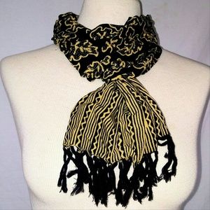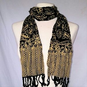 Tropical Style Batik Black & Gold Yellow Silky Rayon Scarf with Fringe.
