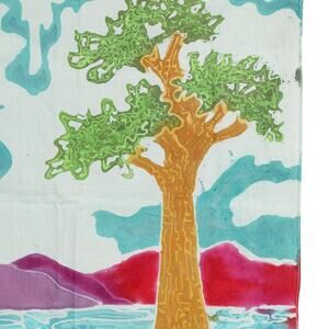 Elevate your space with this stunning batik wall art featuring a tranquil scene of a tree, river, and mountains. With its vibrant colors and intricate design, it adds a touch of nature-inspired beauty to any room. The grommets make it easy to hang and display as a focal point in your home or office.