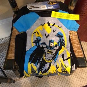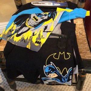 DC comics Batman 4 pieces set sleepwear. One with shorts and the other with long pants. Colors aqua blue, yellow abd black the other set colors are grey, black and yellow. Size 3T. Box 14