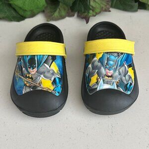 These Batman-themed slip-on clogs for kids are designed for comfort and style. Featuring a vibrant Batman print, they're perfect for everyday adventures. The adjustable yellow strap ensures a secure fit, while the durable rubber sole provides reliable traction and support.
