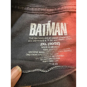 Neck label details: BATMAN logo; care info includes machine wash cold with like colors, non-chlorine bleach when needed, tumble dry low, cool iron if needed; do not iron decoration