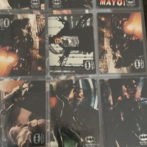 Collection of Batman trading cards featuring iconic scenes and characters. Perfect for fans and collectors.
