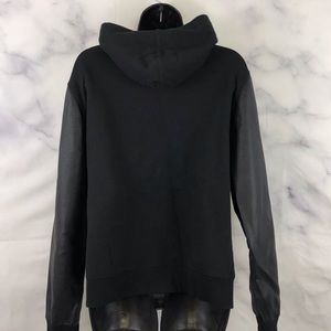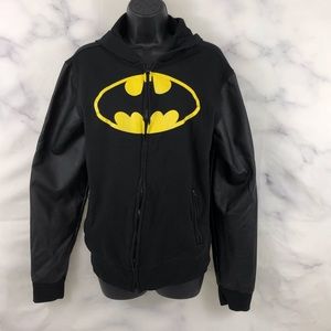 Guc. Yellow Batman logo on black background & faux leather sleeves. No holes, tears, rips, or stains. Approximate measurements laying flat: chest 20”, length 24.5”, sleeve length 26.
