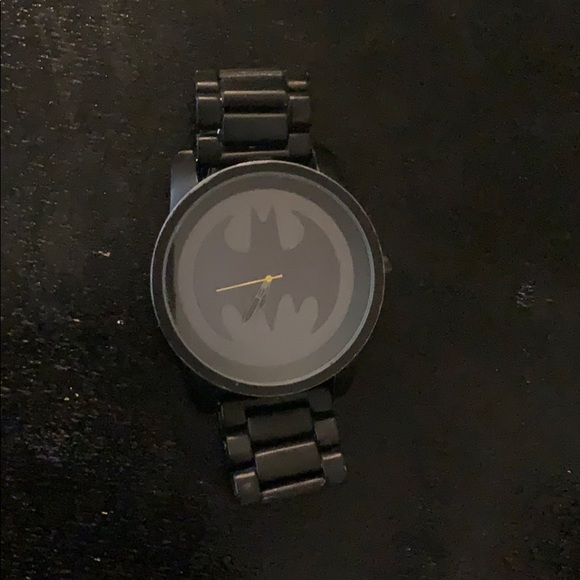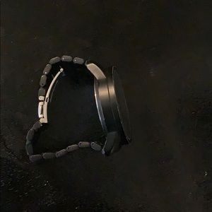 Matt black band, yellow and black arms, has arms for hours minute and seconds